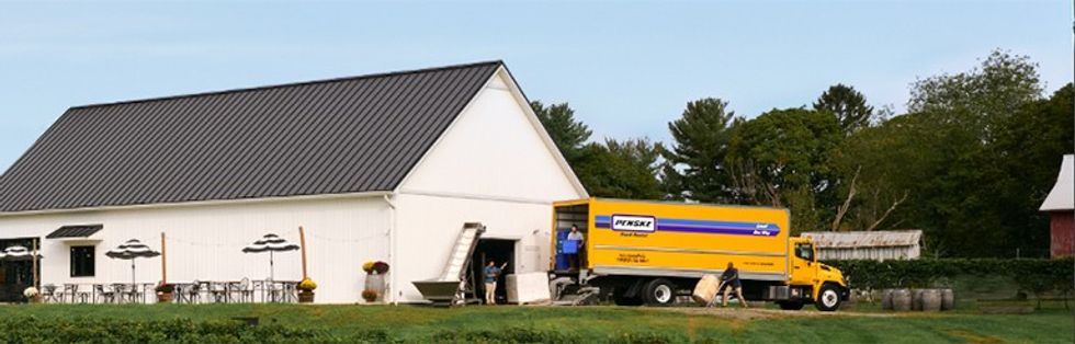 People unloading a Penske truck into a farm house