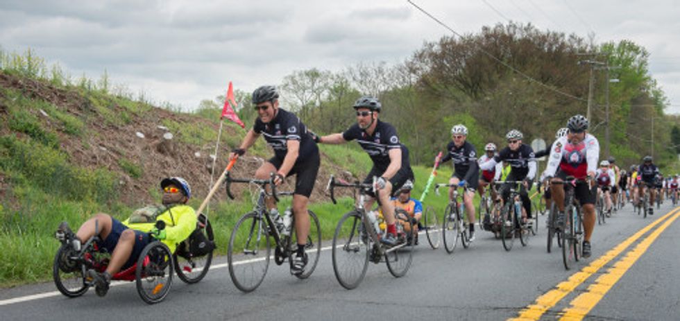 From national non-profit World T.E.A.M. Sports, the annual bicycle and hand cycle ride held in April is one of the largest non-competitive cycling events in the mid-Atlantic region. Athletes from across the United States, Puerto Rico, Canada and Western Europe cycle two routes -- a 110-mile journey from the Pentagon in Arlington, Virginia and a 120-mile journey from historic Valley Forge, Pennsylvania. The two routes merge in downtown Gettysburg, and then riders pedal together through the solemn Civil War battlefields to the finish at the AllStar Expo Complex.